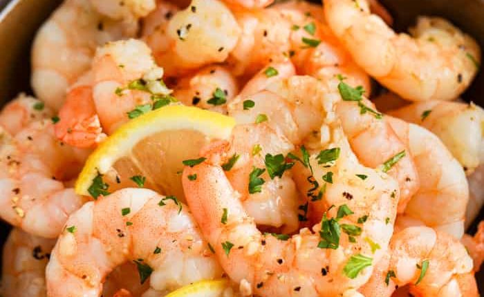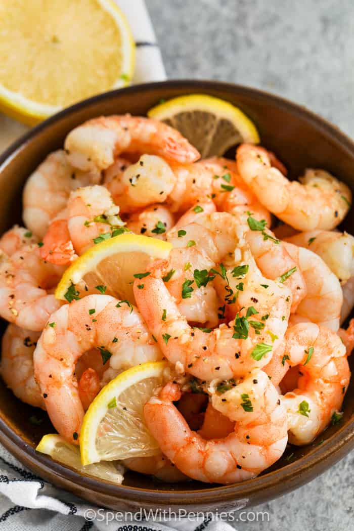 Sauteed Shrimp in a bowl garnished with lemon and parsley
