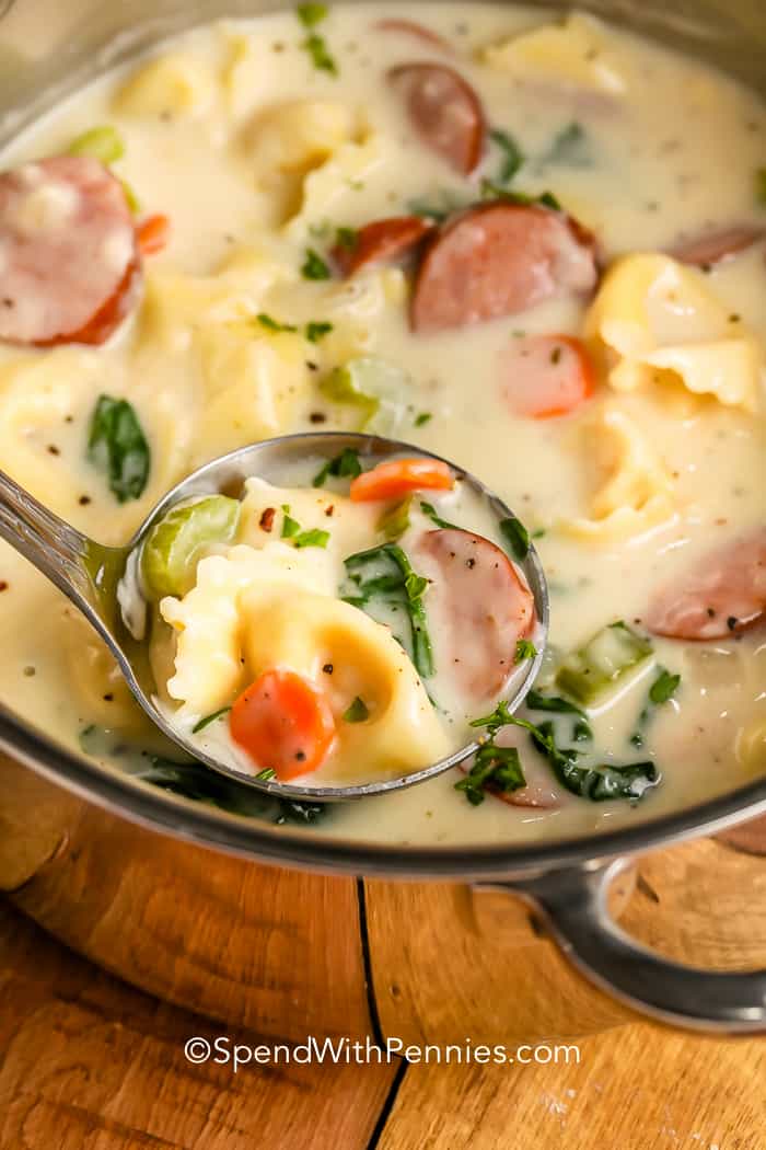 A quick and hearty creamy broth is filled with veggies, smoked sausage, and tender cheese filled tortellini.