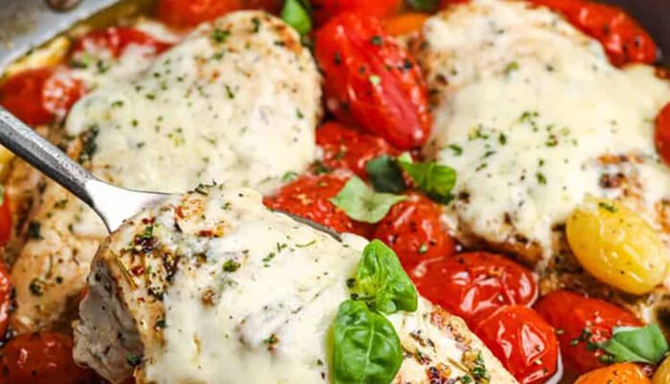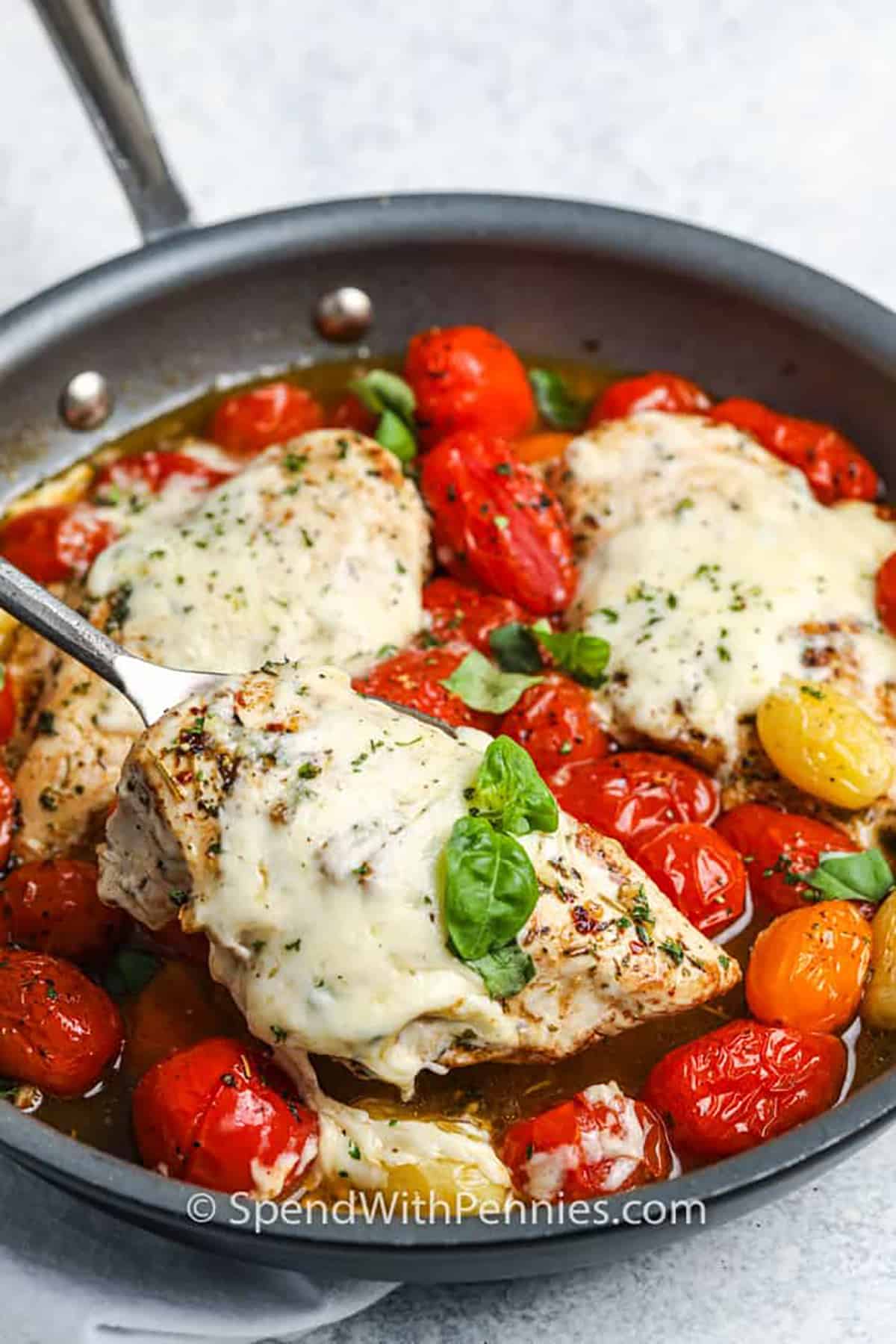 Easy chicken caprese with cherry tomatoes, melted cheese, and basil in a skillet with writing