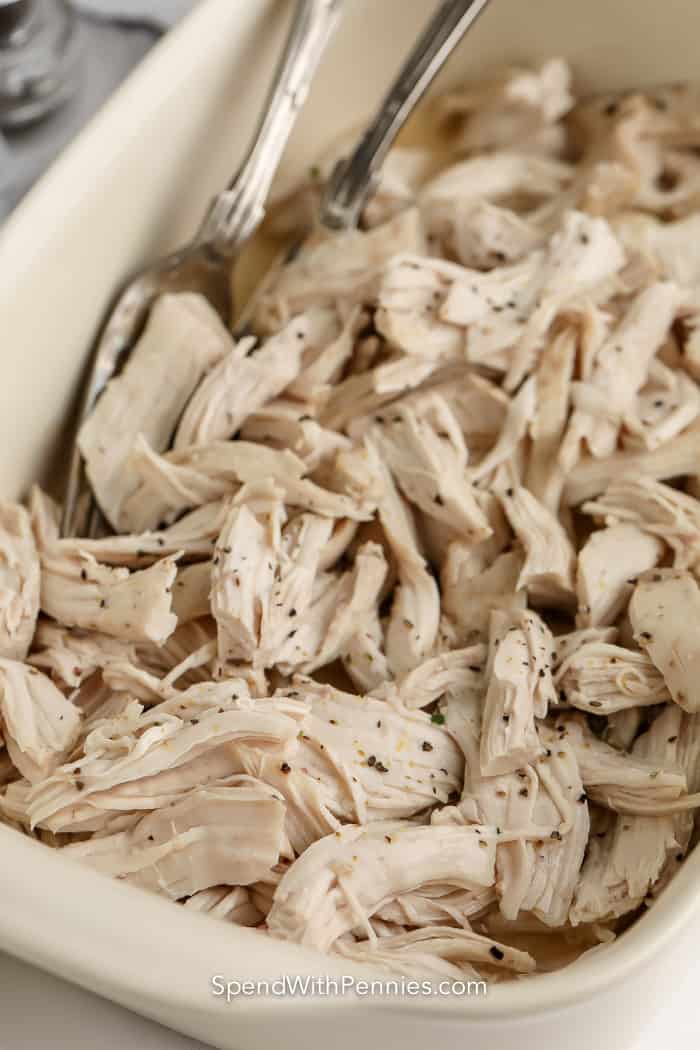 • Using forks or a hand mixer, shred chicken per the directions above. Stir in some of the juices if desired.
