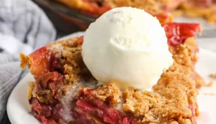 - This rhubarb crumble pie has a sweet tangy filling topped with a crisp crumble for a perfect dessert.