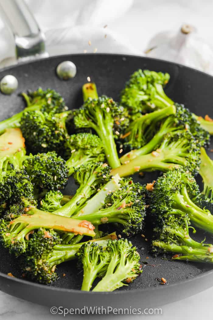Broccoli is stirfried until tender crisp and tossed in a simple flavorful sauce.