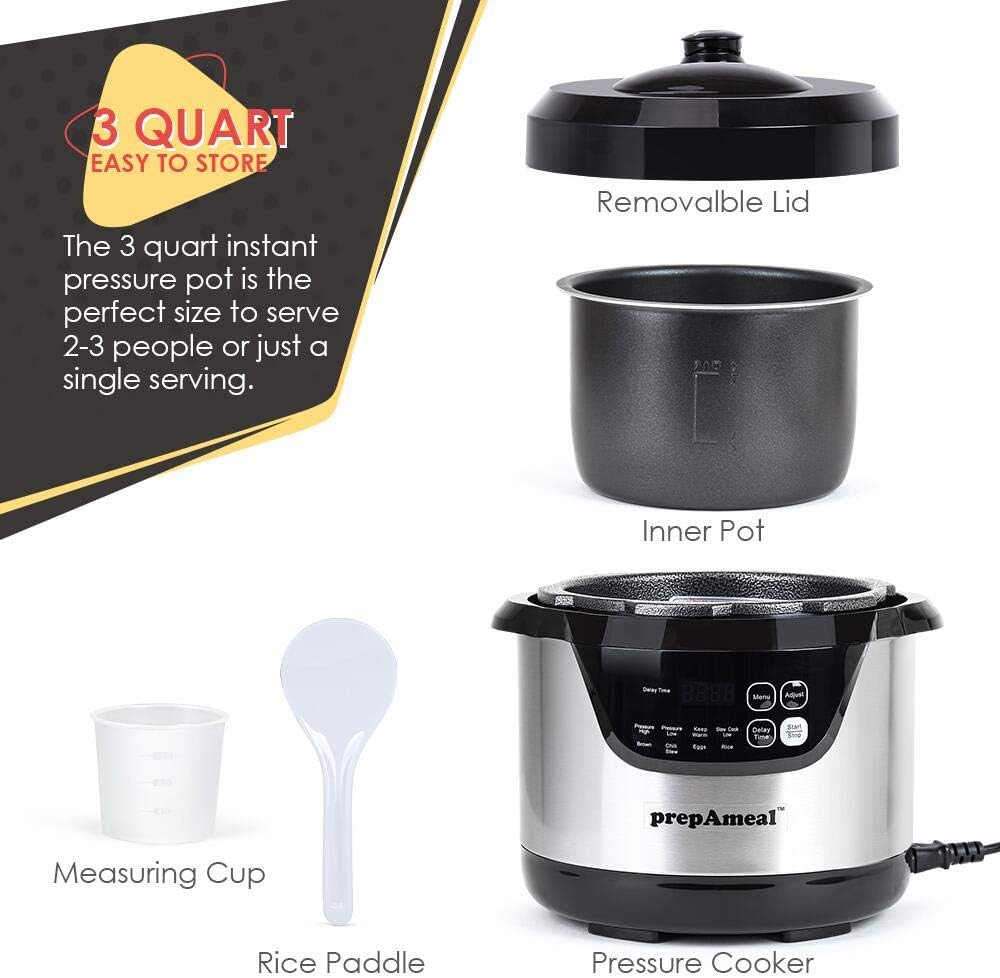 8-in-1 Cooking Functions: The 3qt electric pressure cooker replaces 8 common kitchen appliances, which includes High & Low Pressure Cooker, Slow Cooker, Rice Cooker, Brown Pan, Sauté/chili Stew, Steamer, Egg Cooker, and Warmer;It combines 8 functions in 1, saving 70% cooking time to support your busy lifestyle
