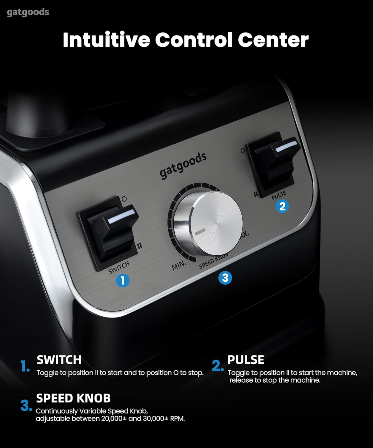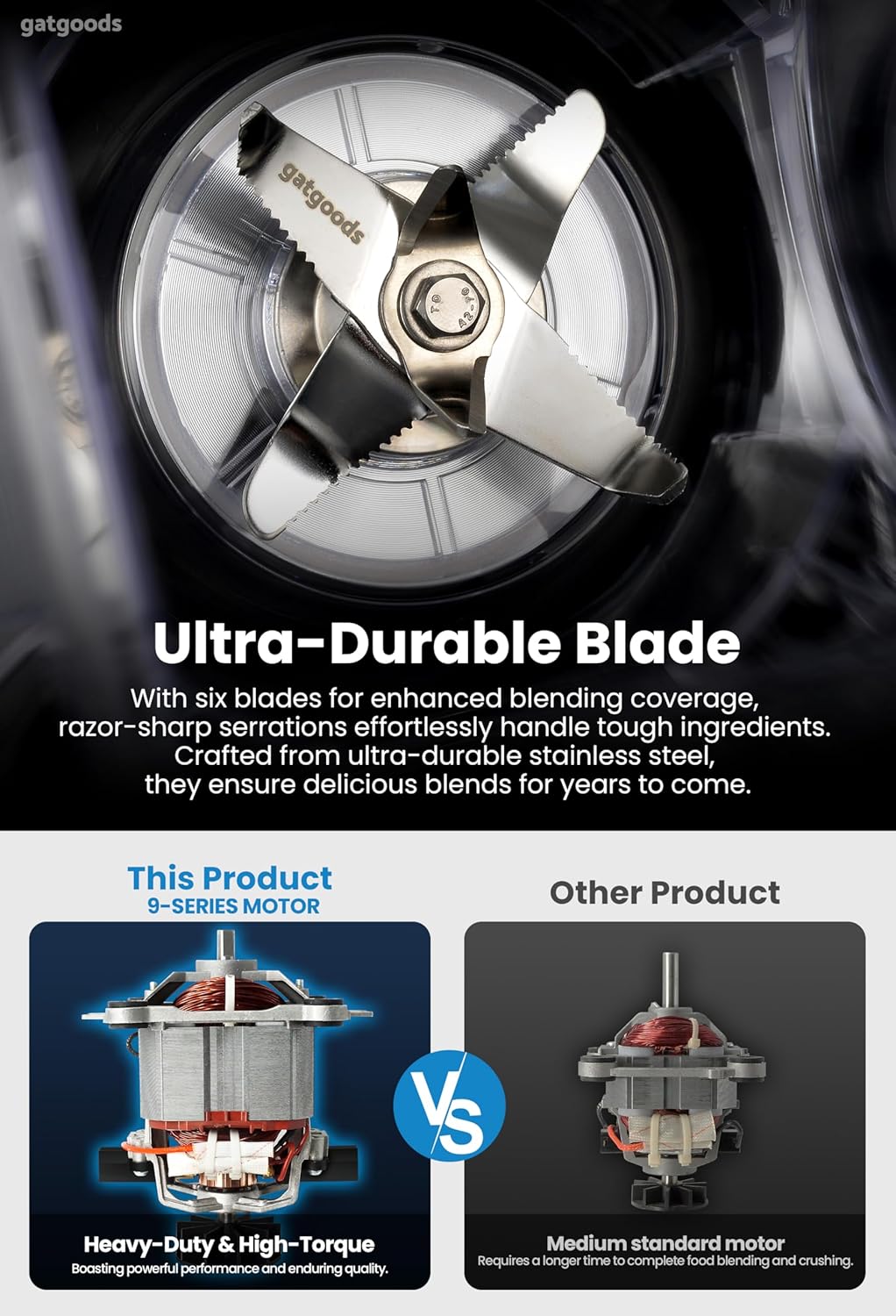 Variable Speed Control: Experience unmatched blending power with our GATGOODS 9-series (Model 821K) high-speed heavy-duty motor, delivering over 50% more efficiency than conventional blenders—perfect for parties, families, and businesses alike. With multi-speed control and a peak of 25,000 RPM, complete your blending needs in just 10 seconds.