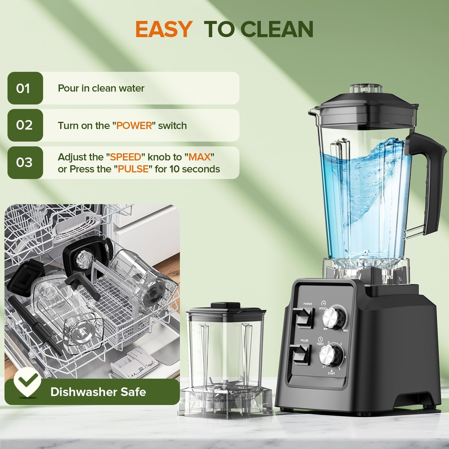 【Hassle-Free Cleaning & Convenient Operation】 Daily cleanup is a breeze. Simply add water and a drop of soap, then use the pulse function for a 60-second self-clean. The 68oz main jar is top-rack dishwasher safe for ultimate convenience.
