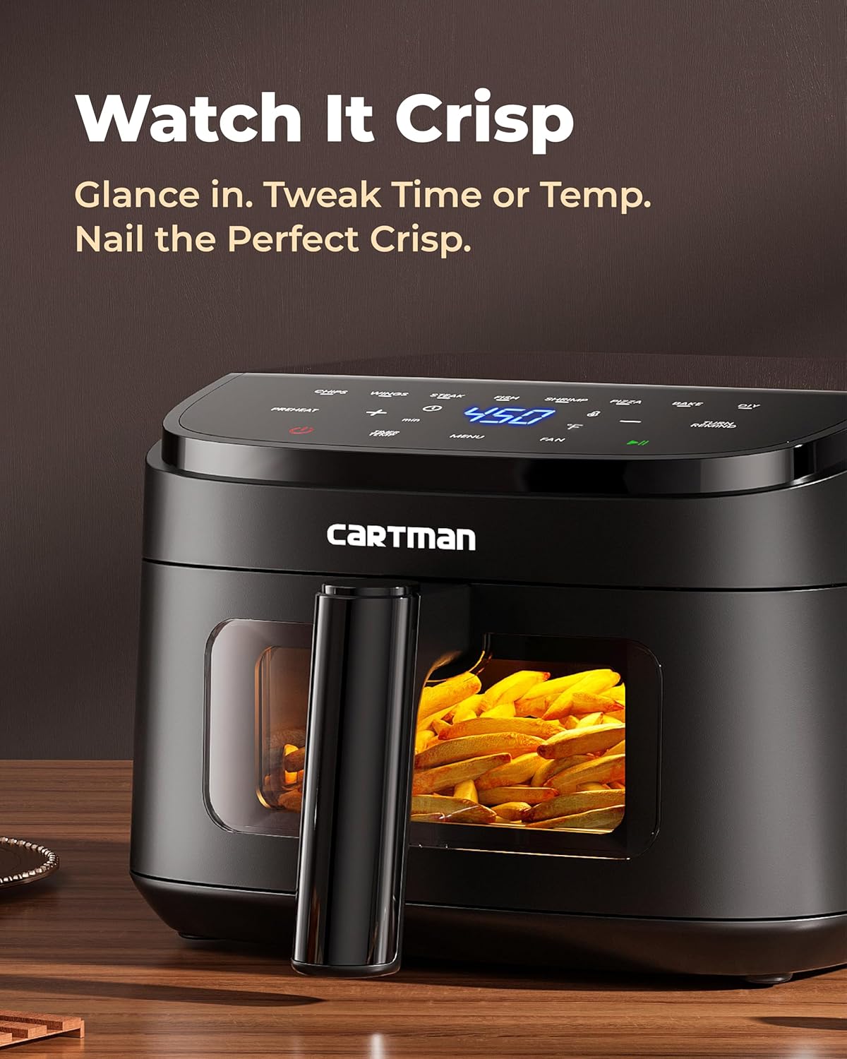 Cartman 4QT Compact Air Fryer, Ultra-Flat 6.7″ Height Small Airfryer, Adjustable Airflow Design, Viewing Window, Up to 450℉, 7 Presets Touchscreen, Portable Air Fryer, Black