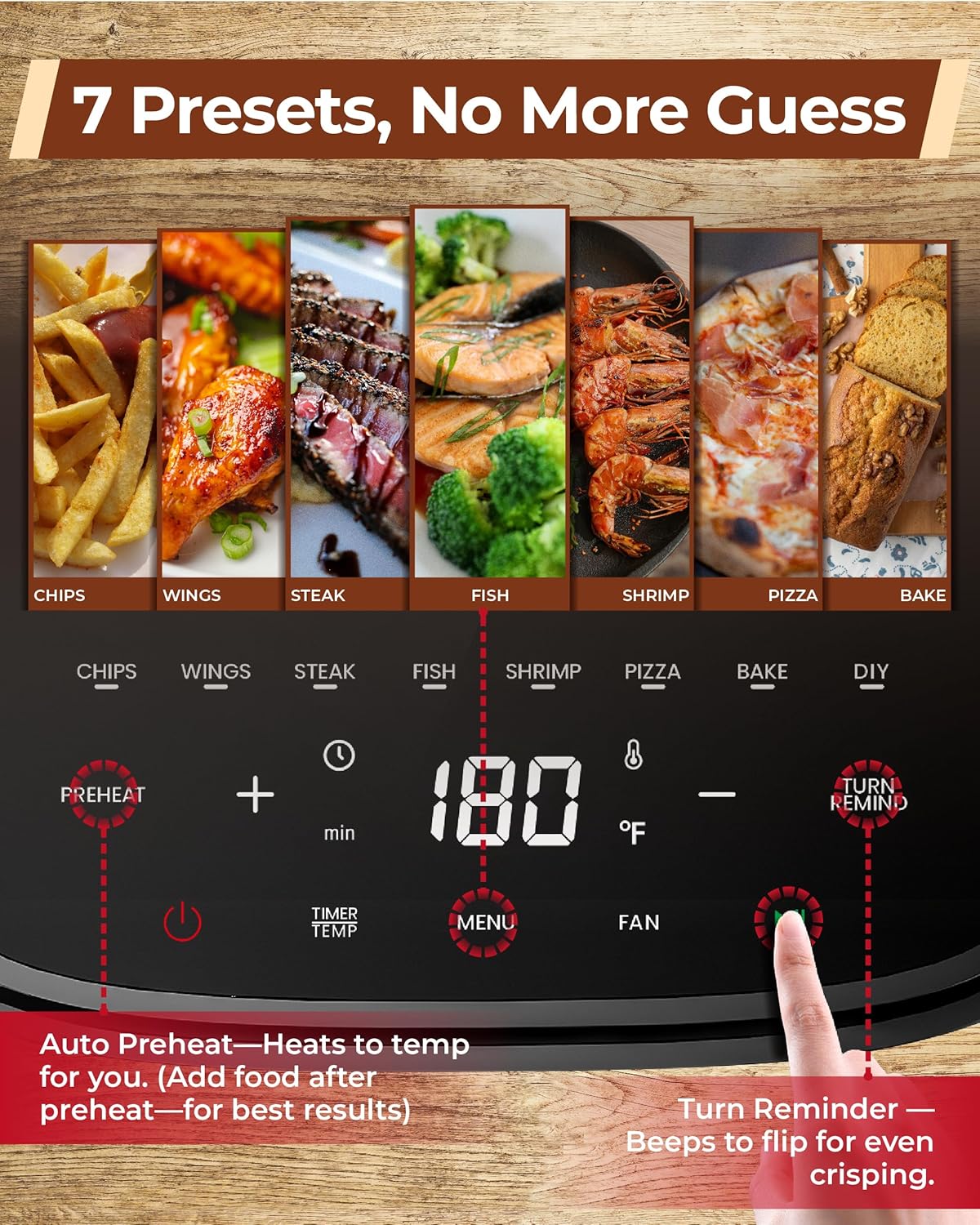 Easy Cooking with 7 Presets:One-touch presets with auto-preheat and turn reminders simplify cooking in this air fryer 4 quart.