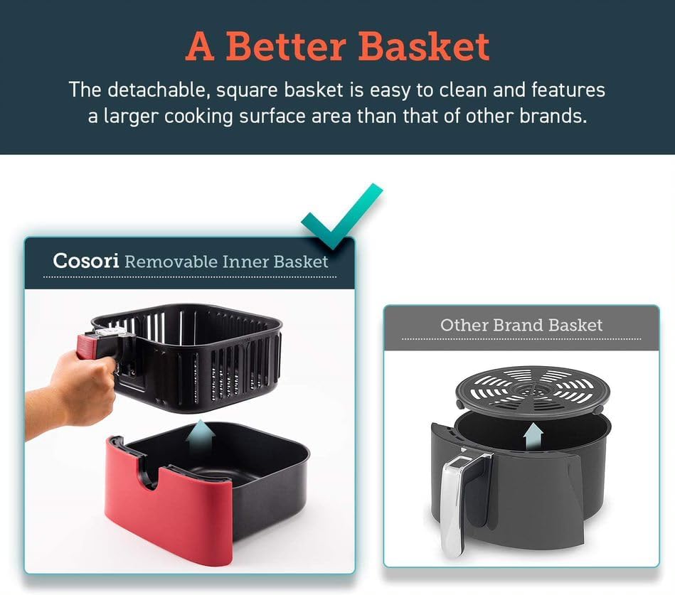 DESIGNED IN CALIFORNIA: COSORI Premium Air Fryer has a special improved ergonomic angled display that provides better viewing, without bending over. A slimmer footprint fits on your countertop and saves your space