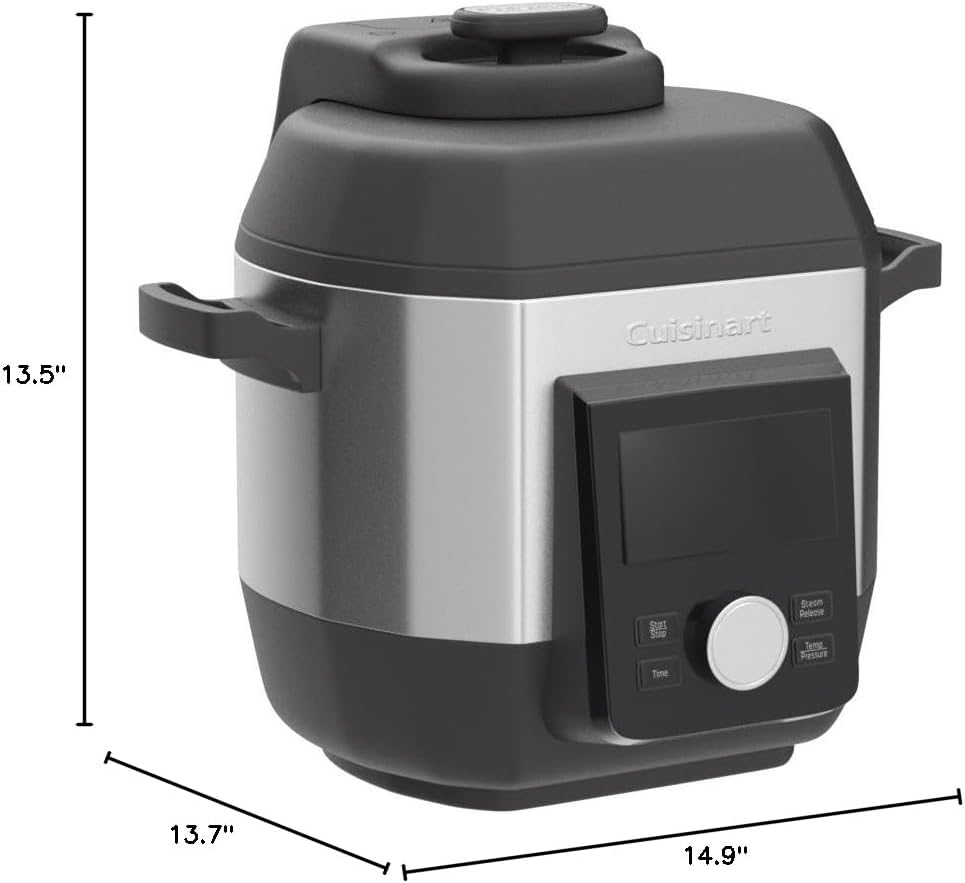 Cuisinart picks up the pressure with this powerful new High-Pressure Multicooker. Cooking under pressure can finish a meal 70% faster, and with its max 15psi, this multicooker can do it even faster! But versatility is the big story. This is a top-of-line multicooker, with 12 preprogrammed settings for everything from meat to risotto to sautéed veggies. It’s truly a pot that does it all. And it makes doing it all so easy, with intuitive digital controls and a large easy-to-read LCD. Uniquely shaped and finished, it’s destined to take center stage on any kitchen counter.