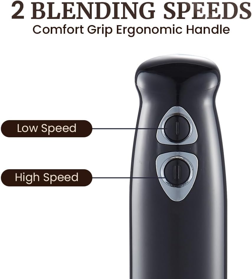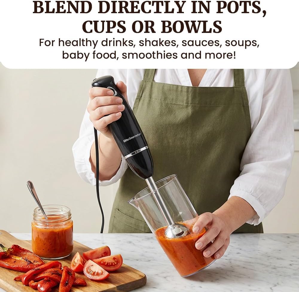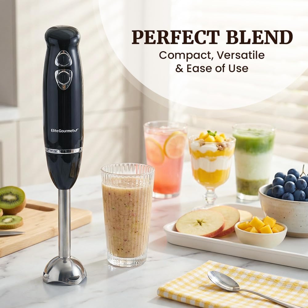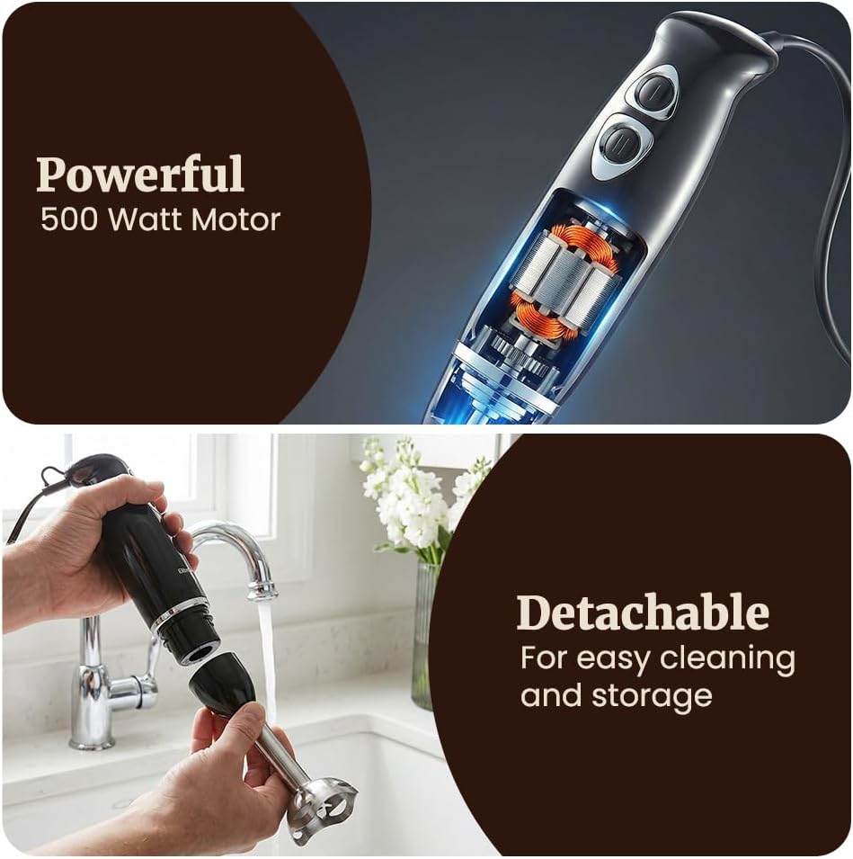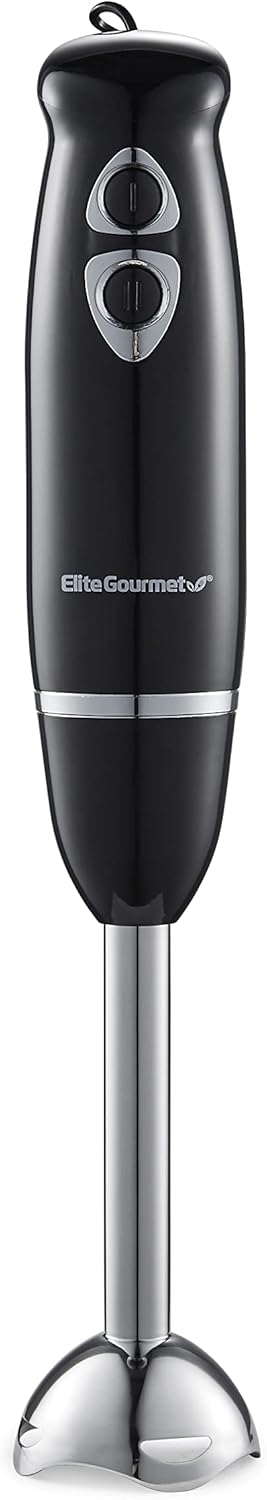Elite Gourmet EHB1015 Immersion Hand Blender 500 Watts 2 Speed Mixing with Stainless Steel Blades, Detachable Wand Stick Mixer, Smoothies, Baby Food, Soup, Black