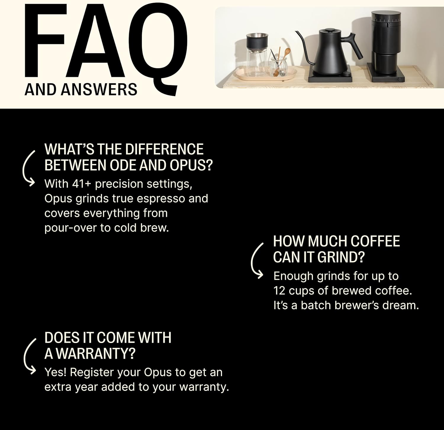 THE DO-IT-ALL GRINDER: Opus is a powerful all-purpose grinder that grinds for the full range of coffee brewing styles—espresso, pour-over, electric coffee makers, French press, and cold brew—with 41+ easily adjustable settings.