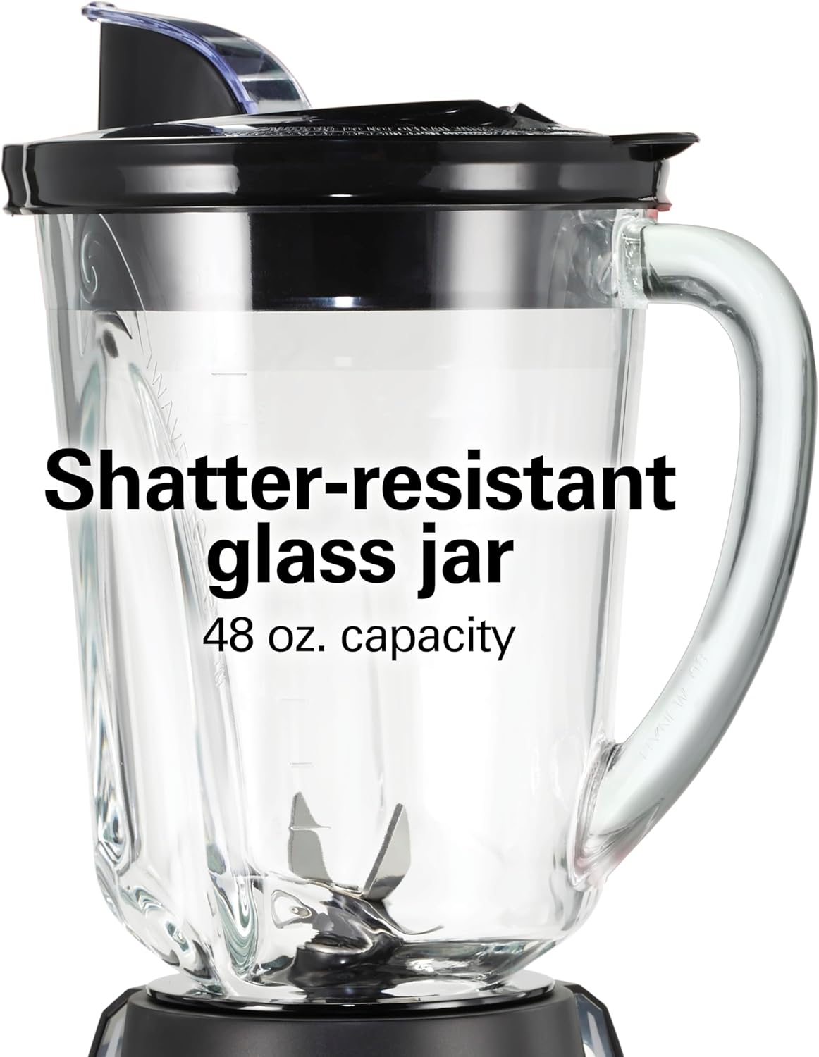SHATTER-RESISTANT GLASS 48 OZ. JAR: The durable glass jar withstands temperatures from icy drinks to hot soups. Blending multiple servings is easy since it holds 48 ounces, and the lid has a flip-up opening to let you add ingredients while blending.