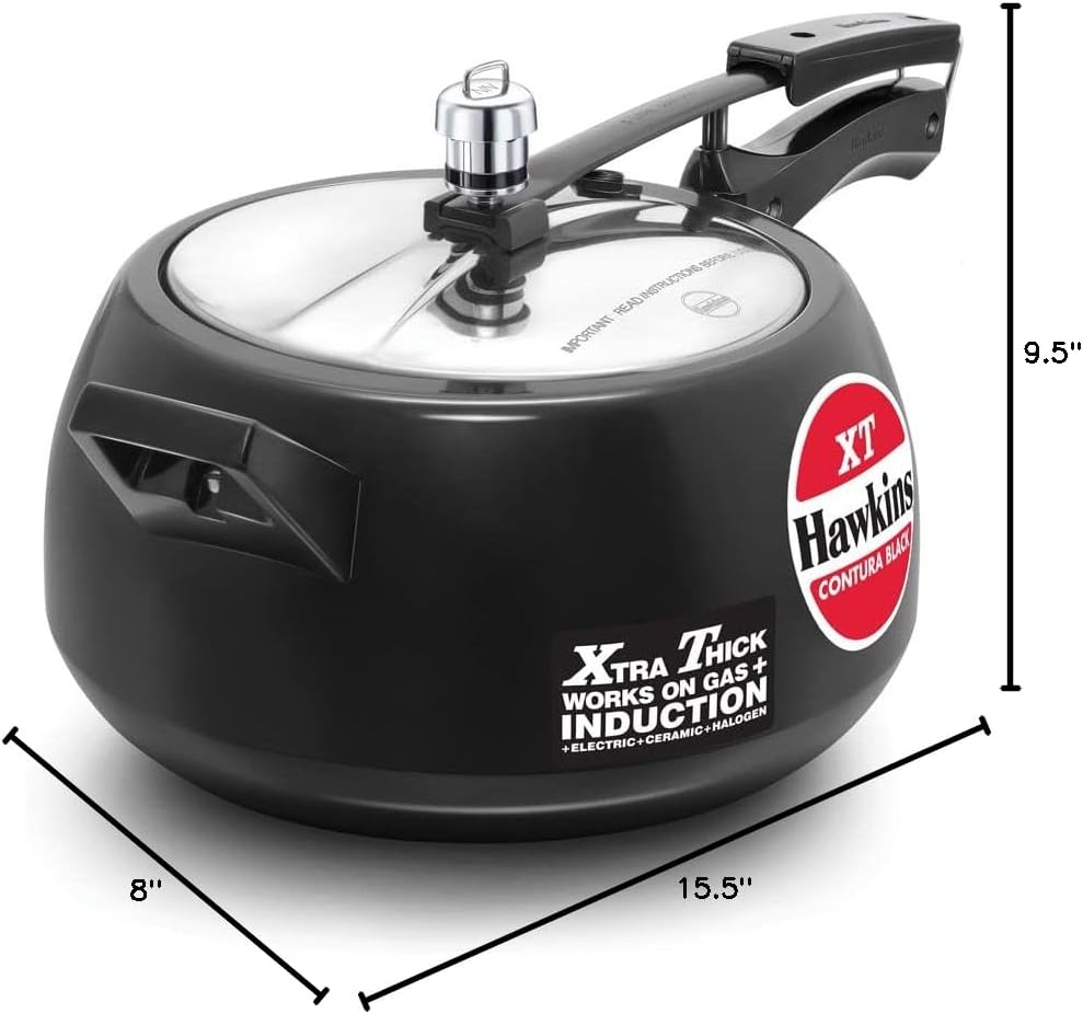 The Induction Compatible Hawkins Contura Black XT Pressure Cooker has all the features of the Hawkins Contura Black Pressure Cooker. Additionally, permanently attached to the 4. 88 mm thick base is a plate of AISI 430 grade magnetic stainless steel which makes the cooker Induction Compatible. The Extra Thick base heats quickly and retains heat well. Suitable for use on all domestic gas, electric, halogen, ceramic and induction cooktops.