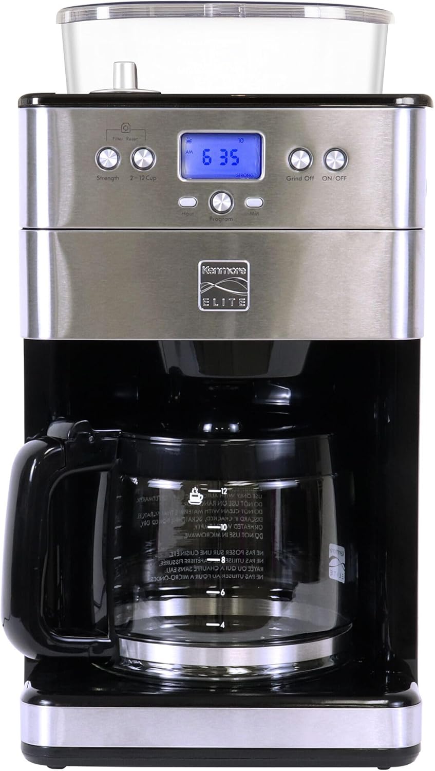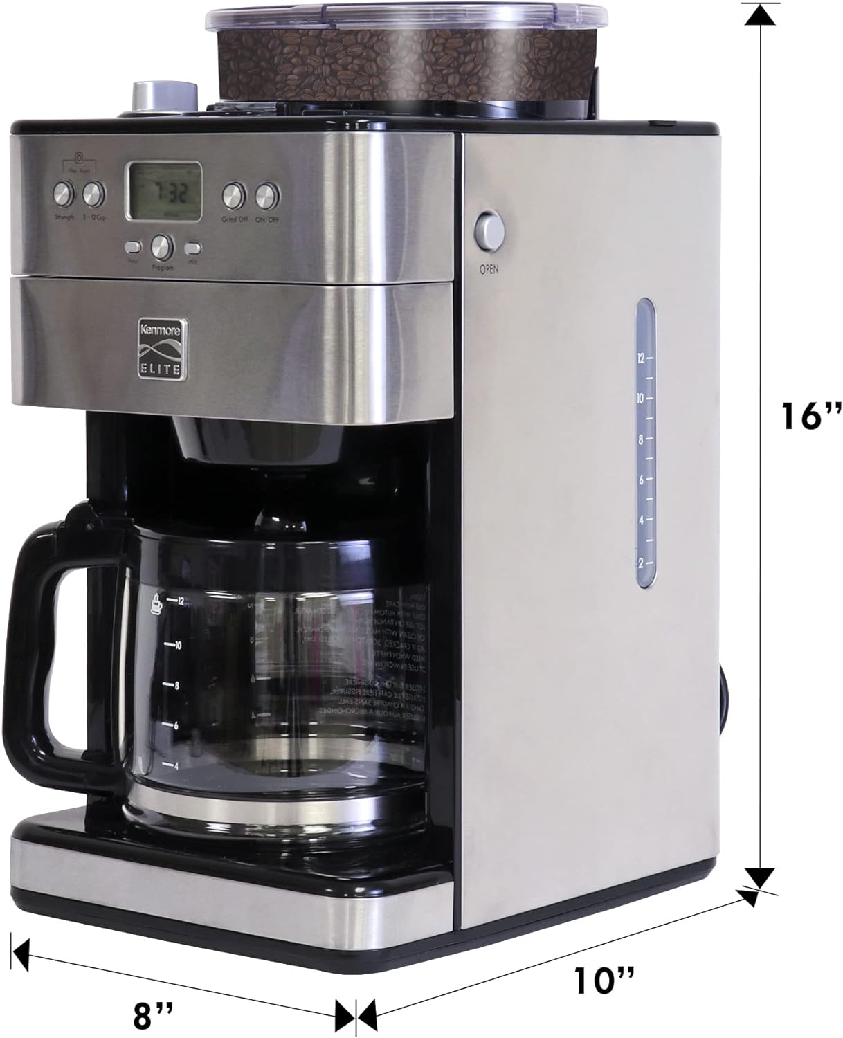 Kenmore Elite Grind and Brew Coffee Maker w/ Burr Grinder, 12 Cup Programmable Automatic Timer Brew Coffee Machine, Air-Tight Bean Hopper, Grind Size and Brew Strength Selectors, Stainless Steel