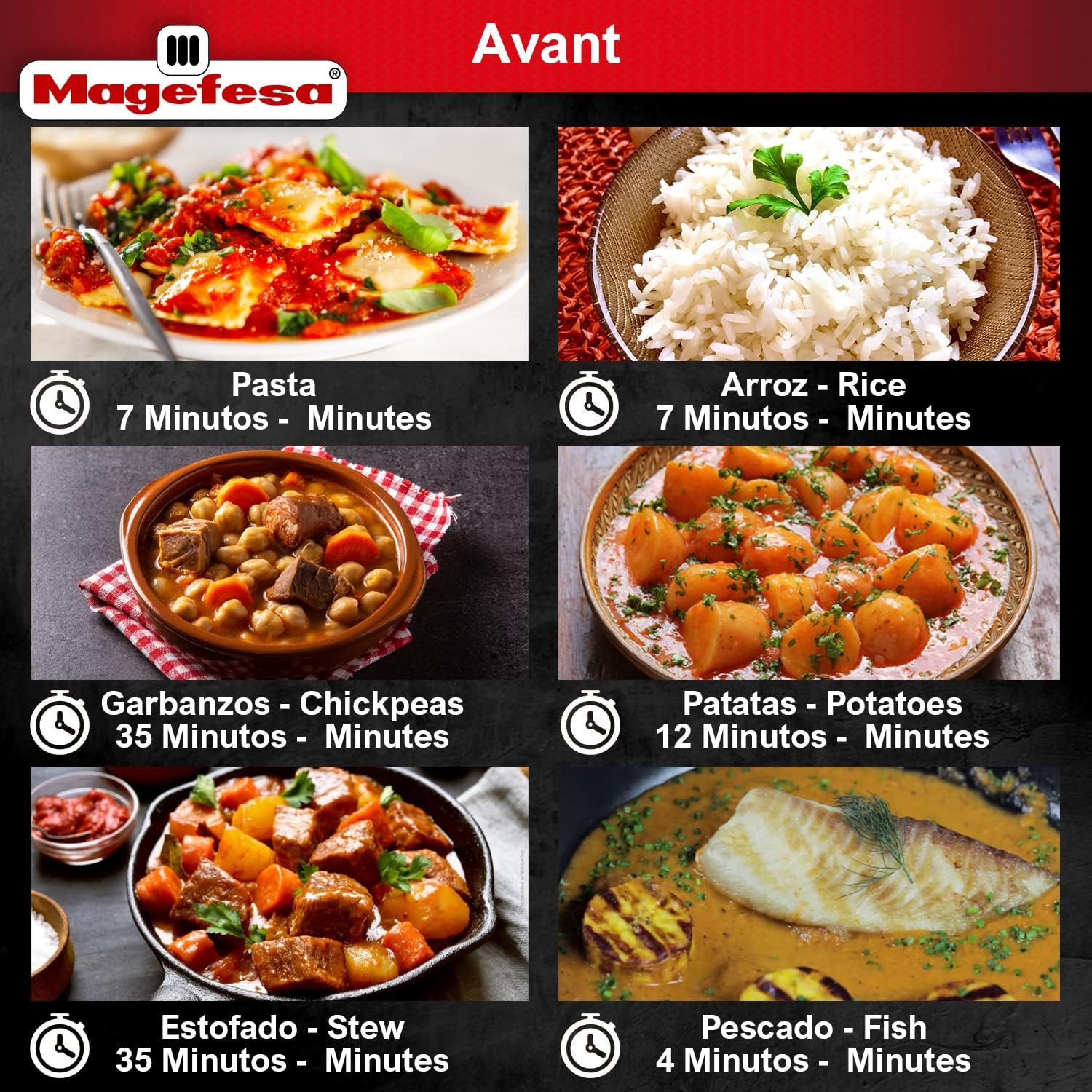 Includes: Magefesa Avant Red stove-top pressure cooker (lid and body), one stainless steel Canner rack, Quick Guide, User’s Manual, Recipe times list and 2-year warranty with Magefesa, the most important brand of pressure cookers in Spain.