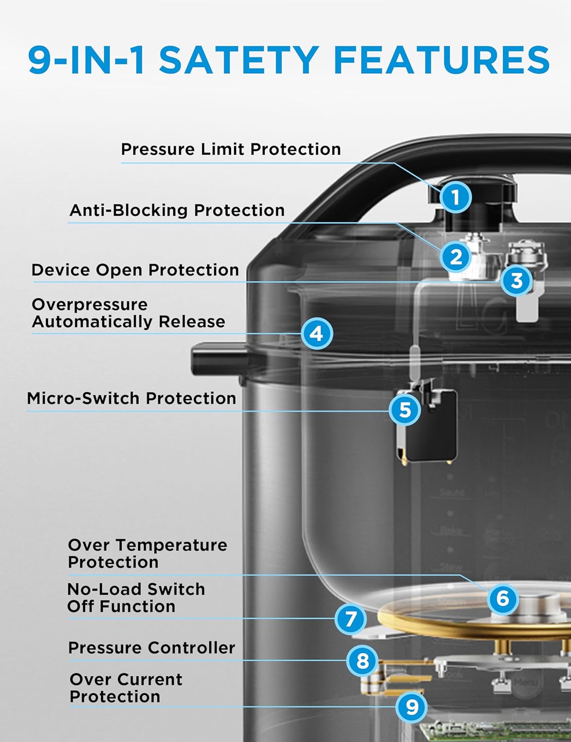 Advanced Protection: Equipped with the advanced REALSAFE SYSTEM, this 9-in-1 safety protection features pressure limit, over temperature, and overpressure automatic release, so you can cook with peace of mind.