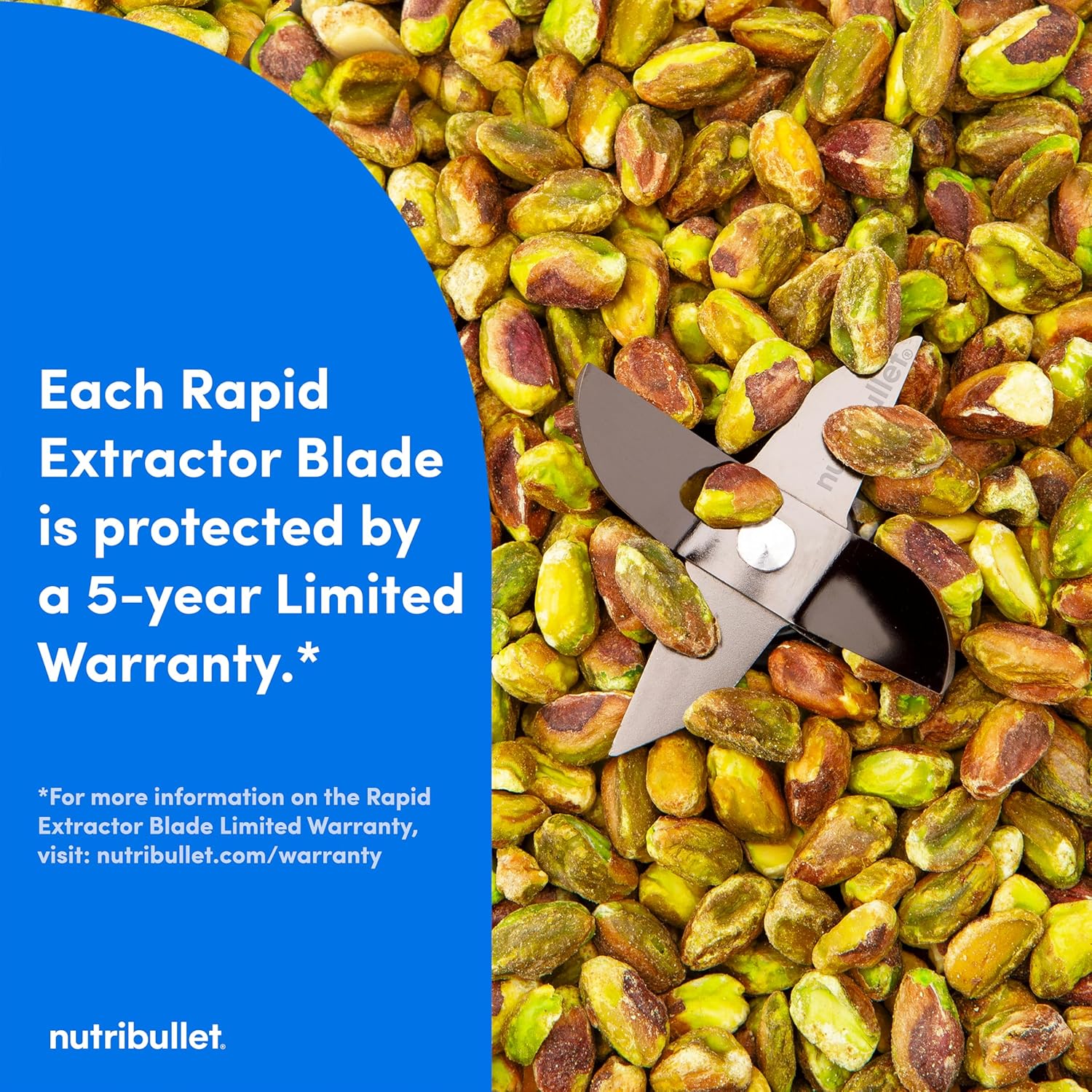 The Rapid Extractor Blade is equipped with a stainless-steel platform and titanium coating to increase longevity and reduce blending time. Each blade comes with a 5-year limited warranty (visit nutribullet.com/warranty for details).