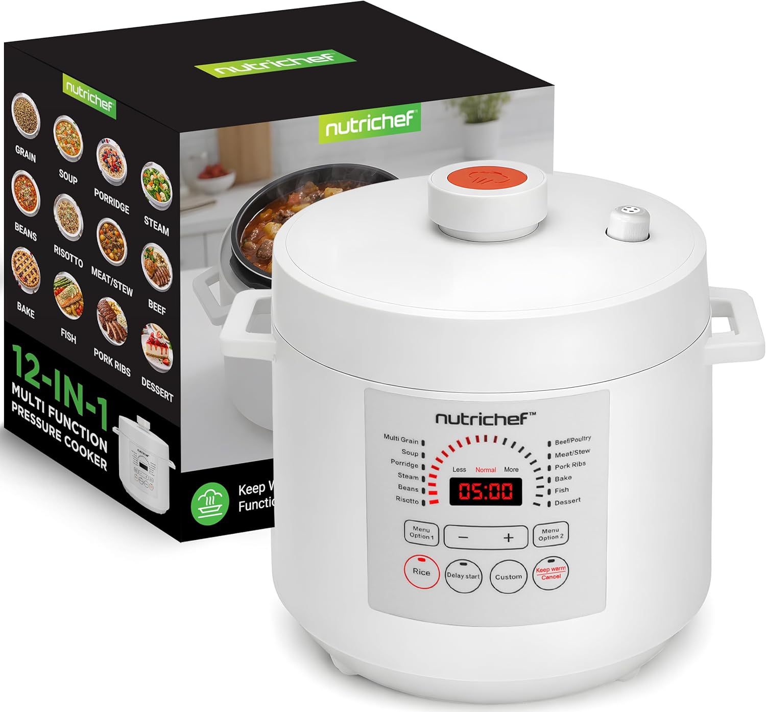 NutriChef 6 Quart Electric Pressure Cooker | 12 Function Digital Countertop Pressure Cooker | Adjustable Time & Temperature | Re-heat and Keep Warm Function | 13.1 x 11.4 IN | White