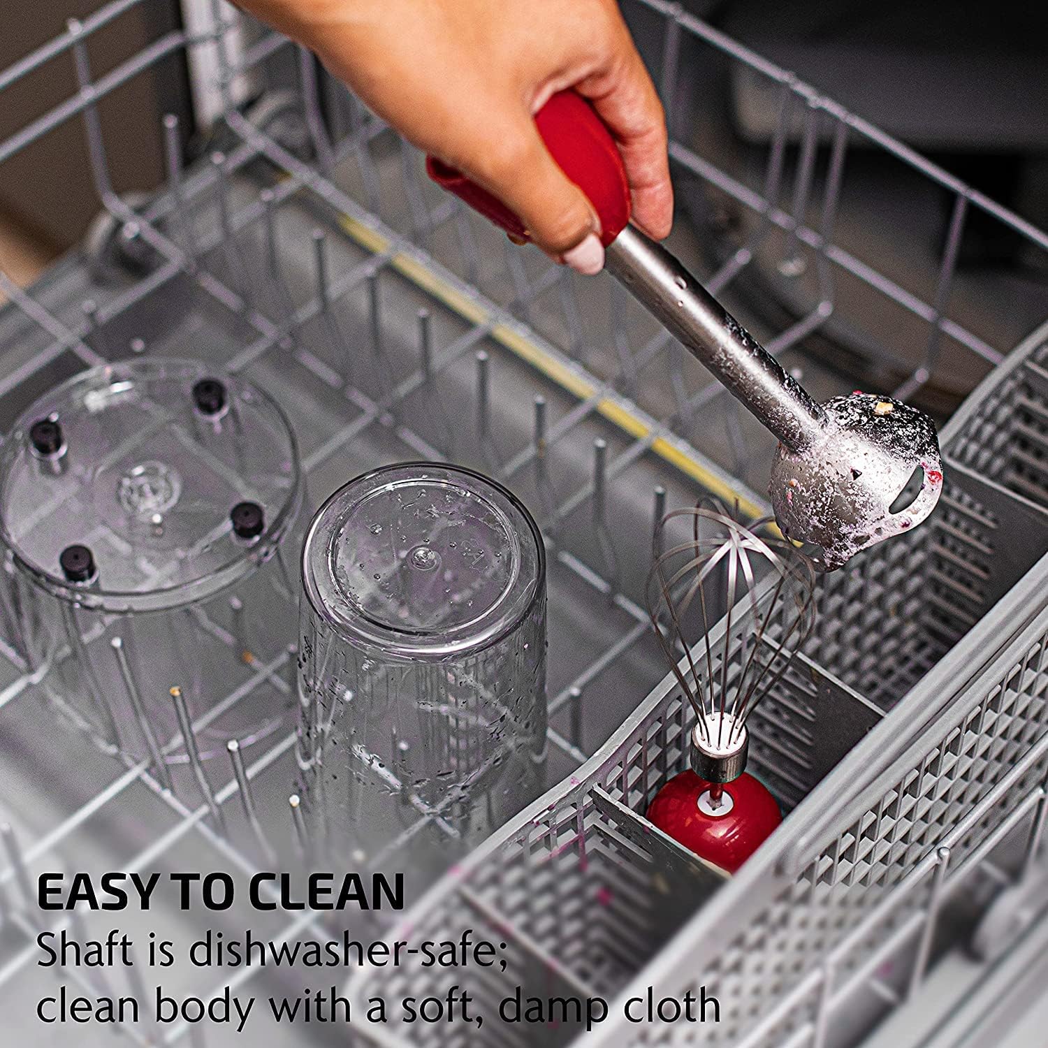 SUPER EASY TO CLEAN – All parts of this handheld blender are detachable for easy cleaning. The detachable shaft, whisk, chopper and beaker can be placed in the dishwasher or rinsed under running water, while the motor body can be simply wiped down with a soft, damp cloth. These parts come apart and snap back together with ease, making cleanup a breeze.