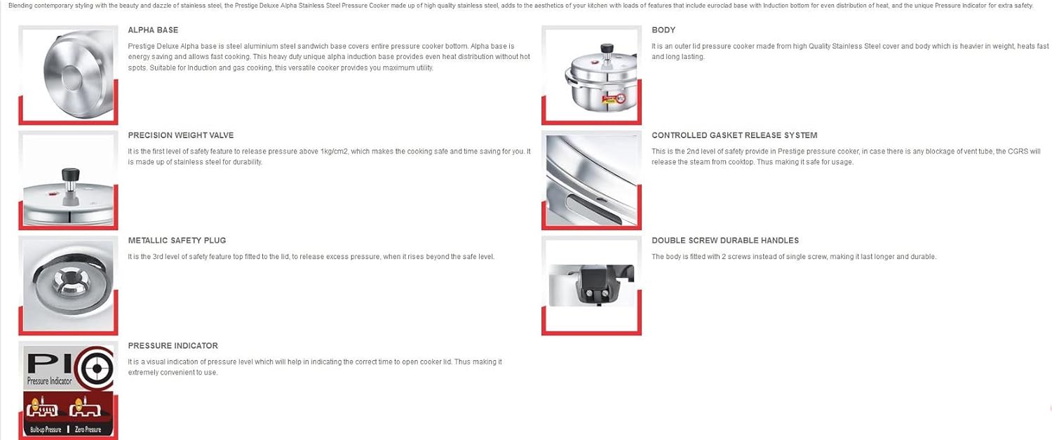 Prestige Deluxe Alpha Stainless Steel Pressure Cooker, 2 Liters/2.11 Quarts