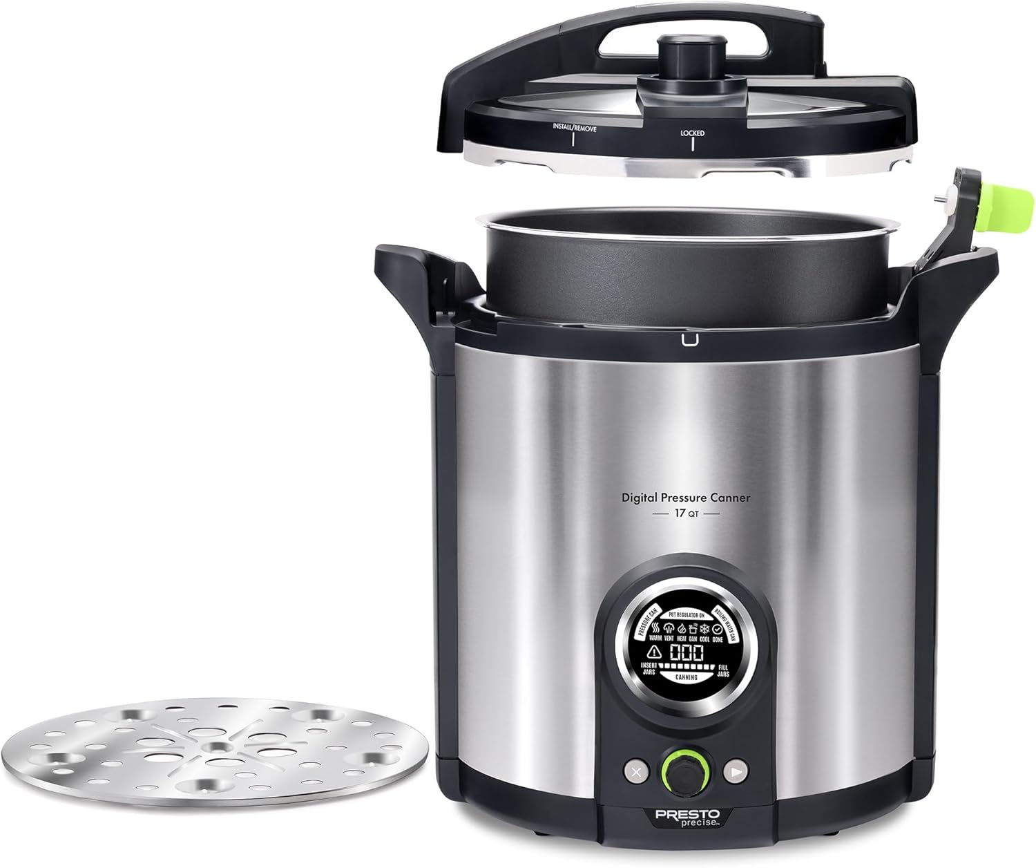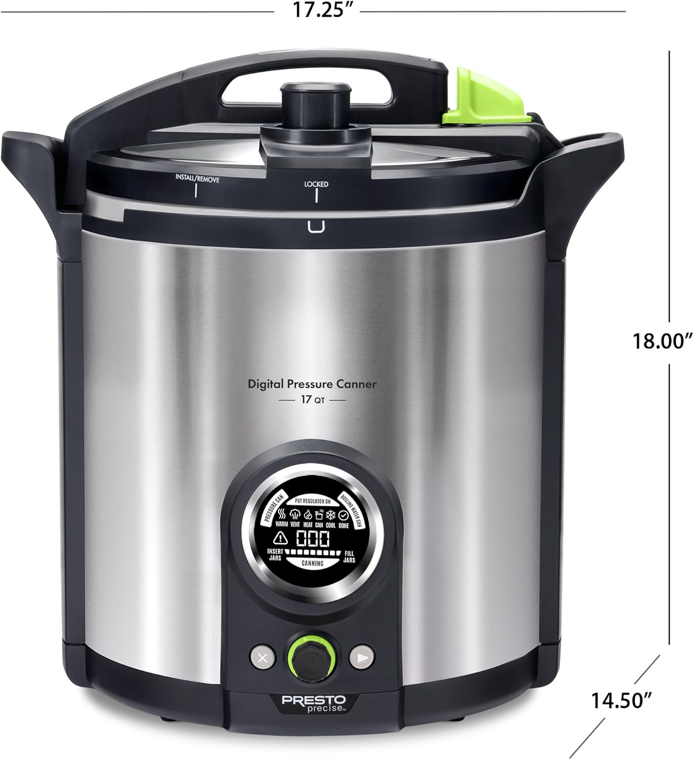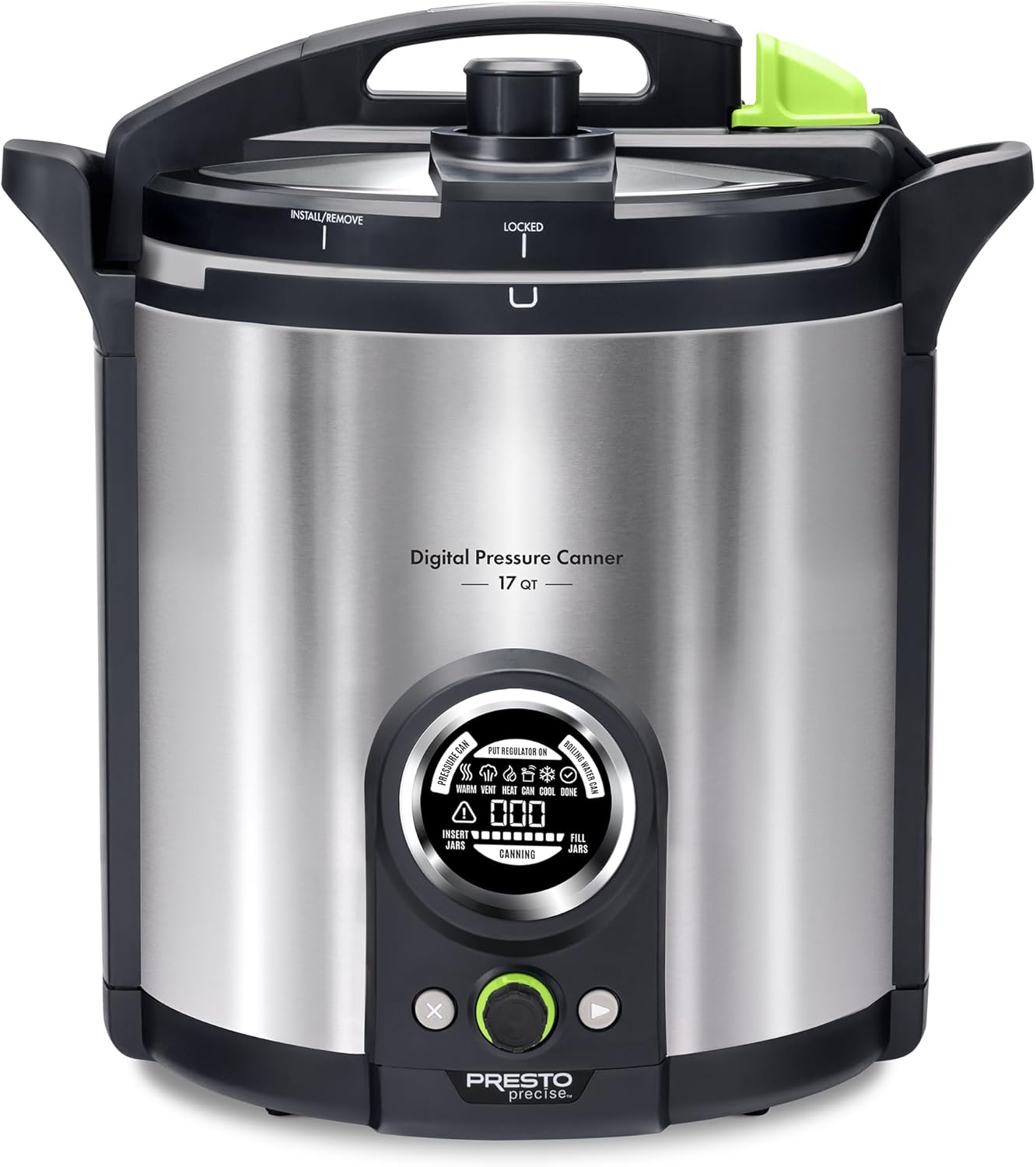Automated for easy, confident home canning, the Presto Precise® 17-quart digital canner features an innovative sensor that holds the exact processing temperature required for safe home canning with no adjustments necessary, even when pressure canning at high altitudes. Its extra-tall size holds quart jars for both pressure and boiling water canning. Use the digital interface to select the canning method and processing time. A built-in timer ensures accurate, reliable timing. LED display icons illuminate and guide you through each step of the canning method. The canner preheats the jars then holds them at the proper temperature until all jars are filled and ready for processing. To simplify the boiling water method, the temperature sensor detects the boiling point and automatically activates the canning process to safely can high-acid foods. The digital canner also holds heat inside, keeping your kitchen cooler while canning. When finished, the PFAS-free ceramic-coated pot is removable for easy cleaning. Included with the canner are a stainless steel canning rack, an instruction/recipe book that uses standard processing times in accordance with USDA guidelines, and an easy-to-reference quickstart guide. Presto Precise® digital pressure canner is equipped with ten built-in safety features including a cover locking system and an alert symbol for indicating an incomplete canning process.Regular mason jar capacity: Pressure Canning 19 half-pints, 8 pints, 5 quarts | Boiling Water Canning 10 half-pints, 8 pints, 5 quarts