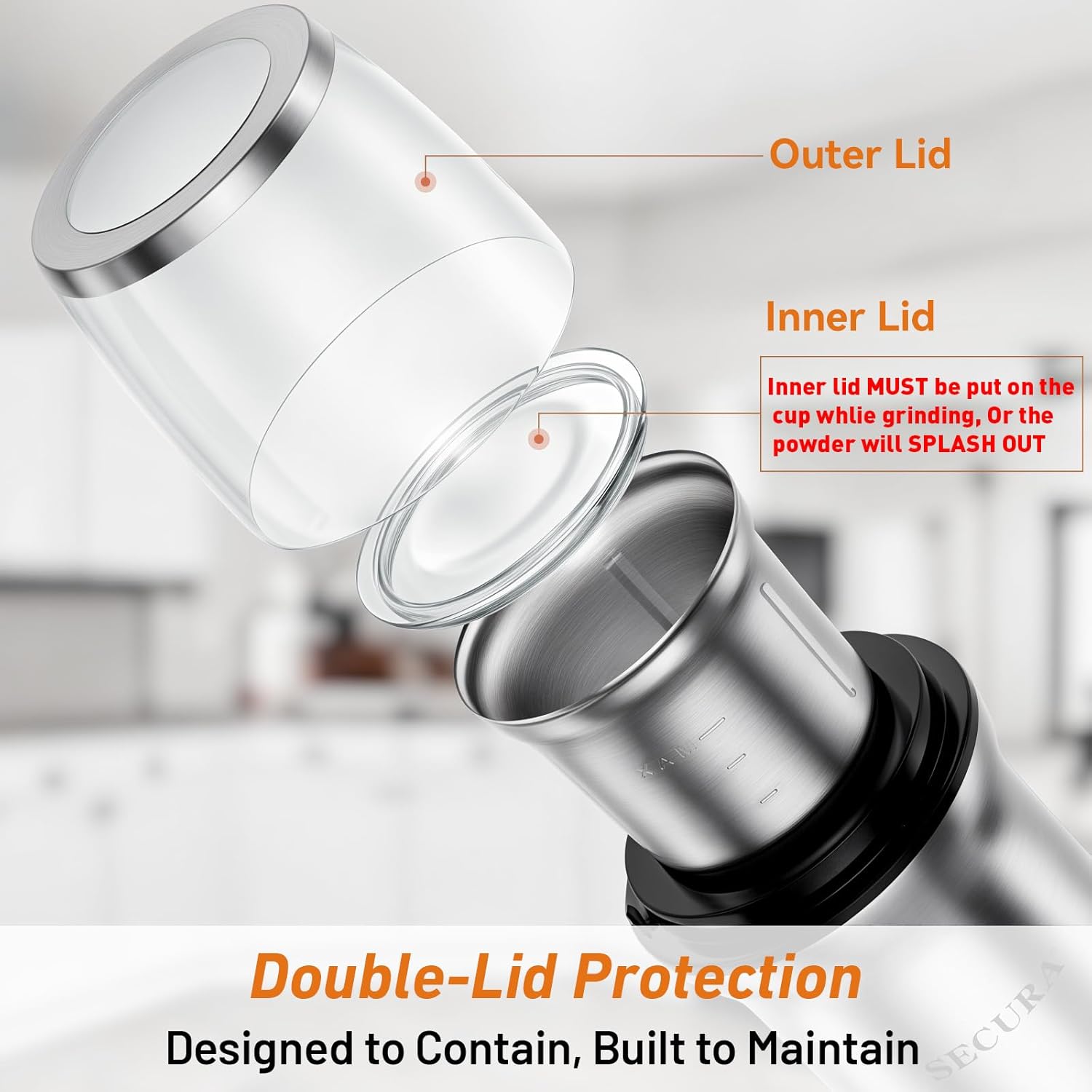 Secura Electric Coffee Grinder and Spice Grinder with 2 Stainless Steel Blades Removable Bowls