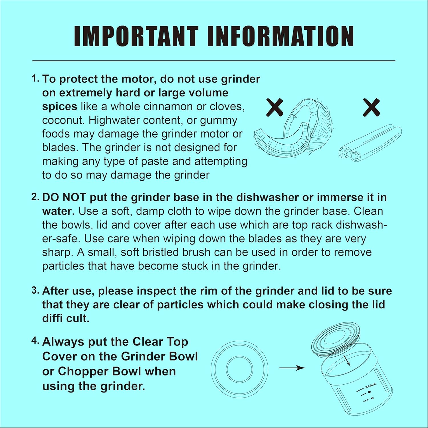 Note – Always put the inner lid on the bowl before grinding. Avoid exceeding the Max line volume at one time or grinding very hard foods such as cinnamon, cloves or coconut, as these foods may damage the motor, inner lid or cause other problems. There will be a certain sound when grinding