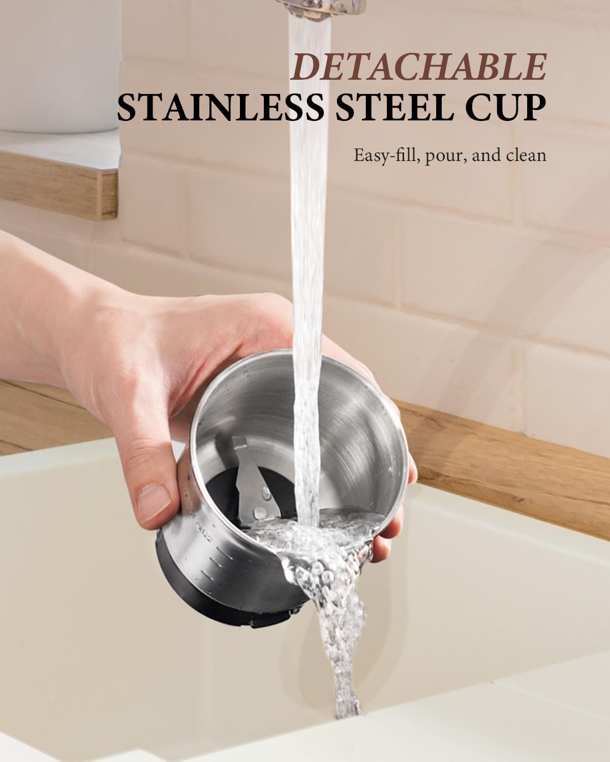 ★【Detachable Stainless Steel Cup】This dishwasher-safe, 2.5 oz. removable stainless steel cup grinds coffee beans for up to 12 cups of coffee, and is easily fillable and pourable.