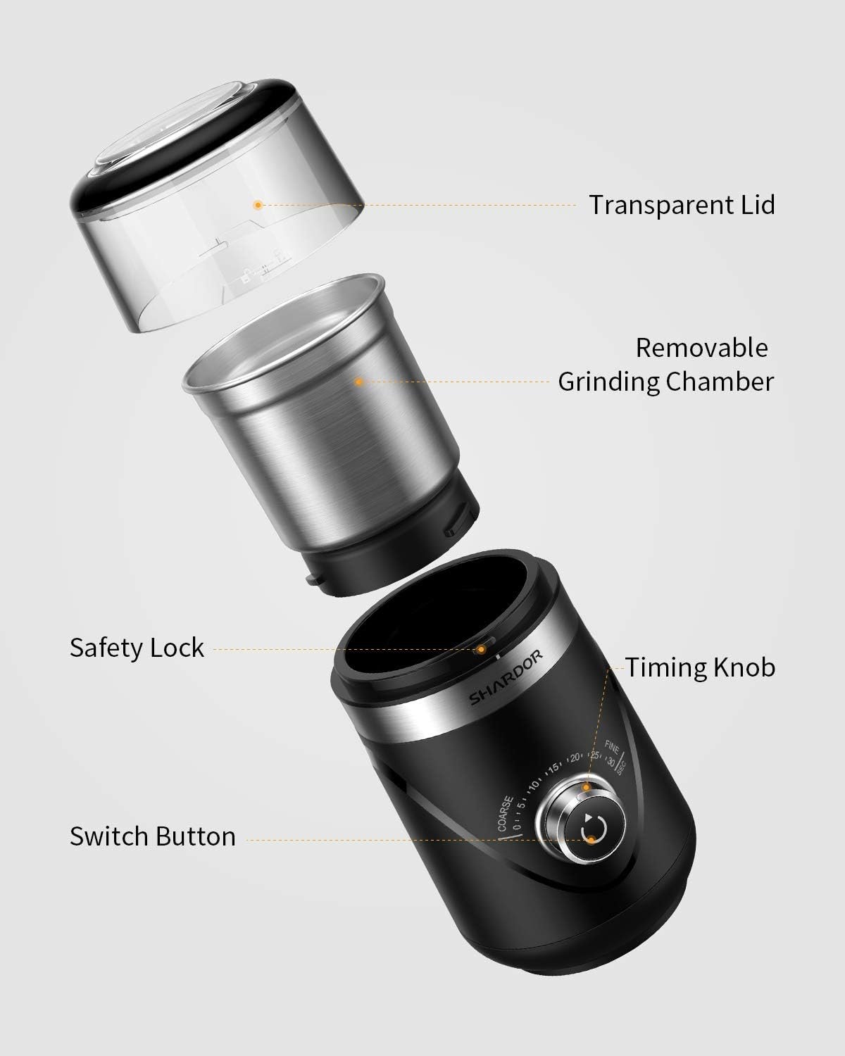【Removable Grinding Cup】The cup is removable and it can grinds 2.5oz coffee beans, up to 10 cups of coffee.