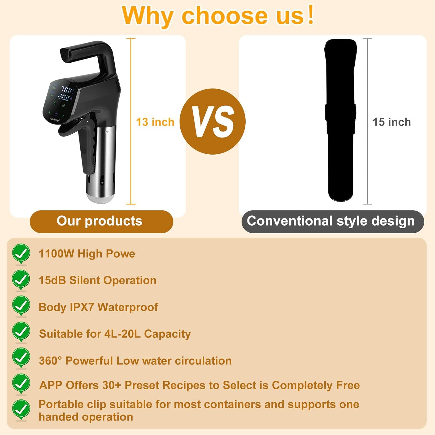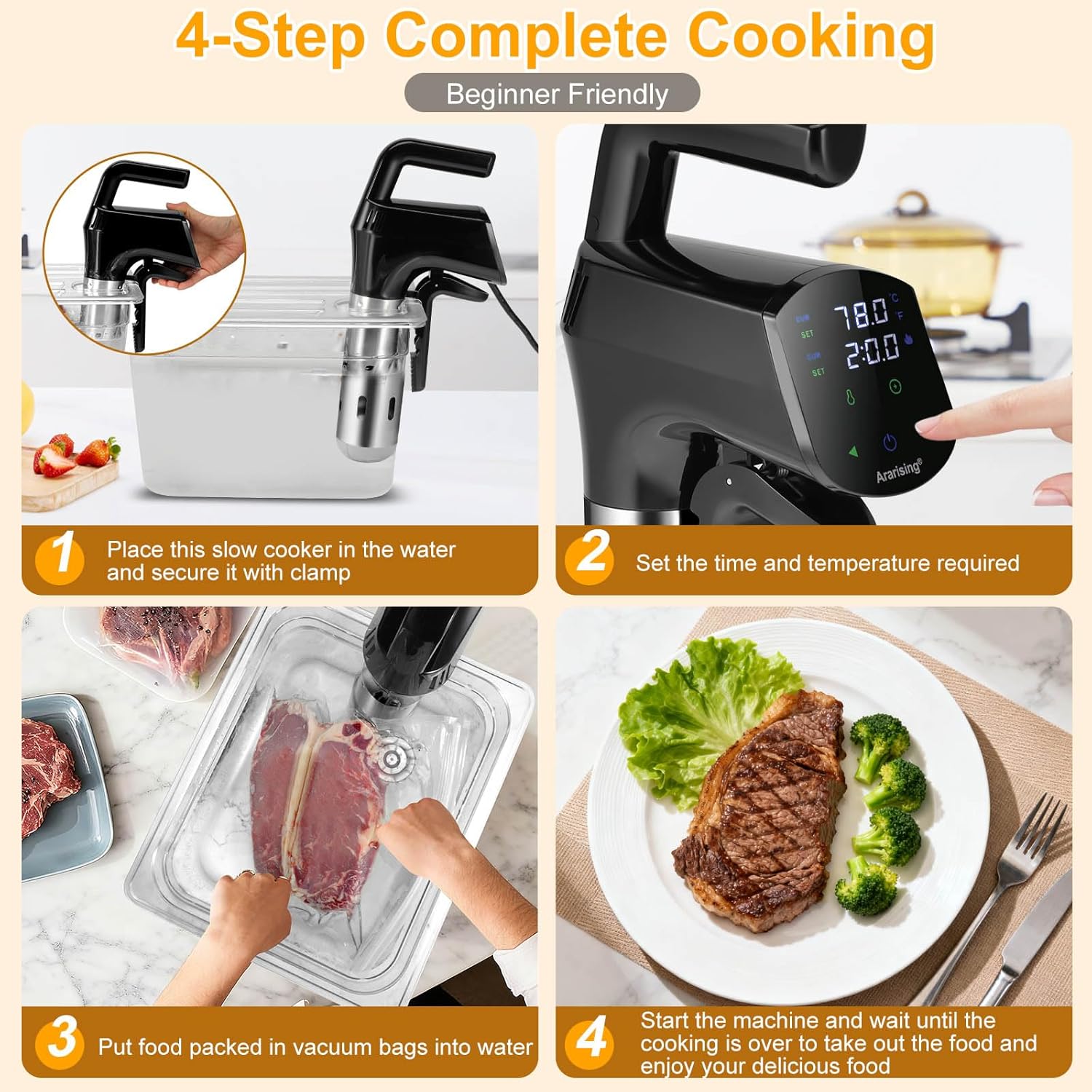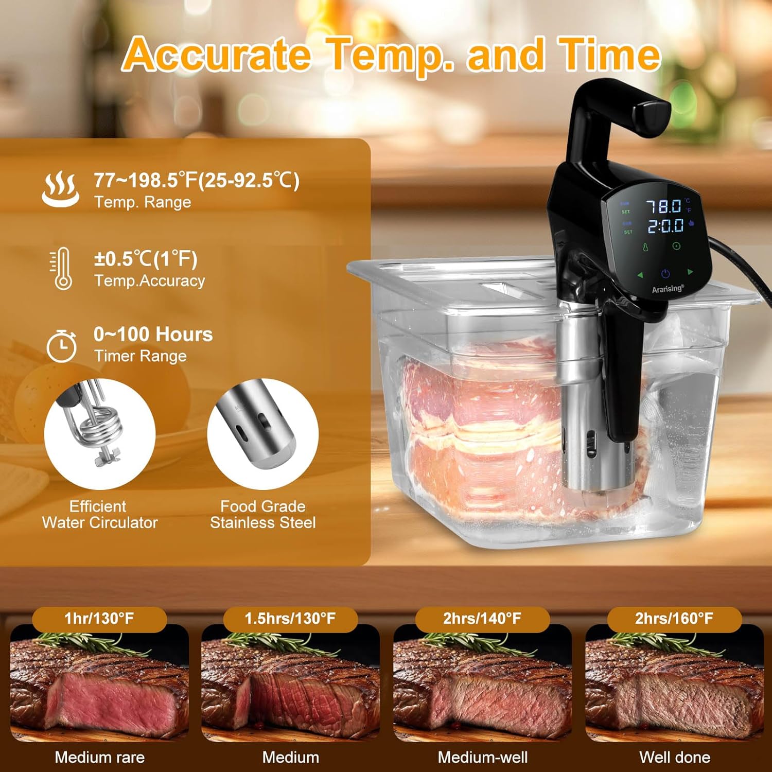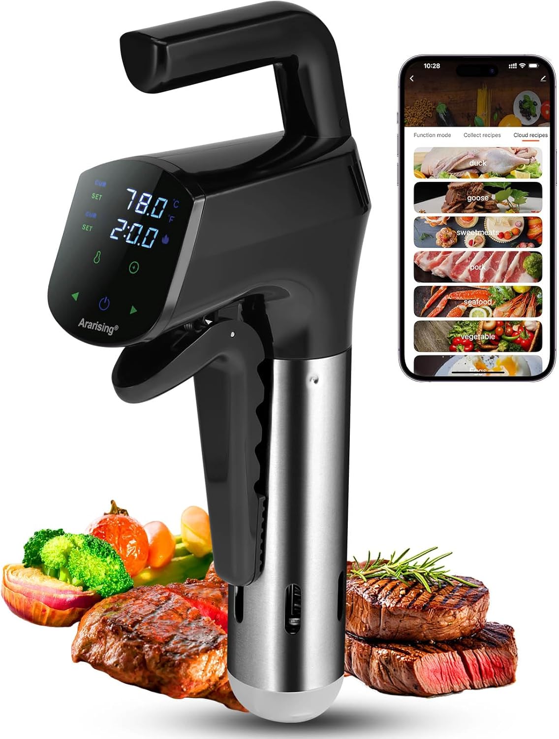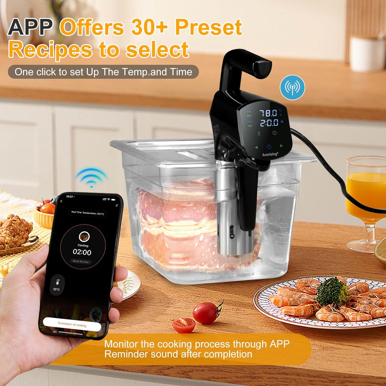 Wifi Remote Control: Utilizing a 2.4GHz WiFi connect the Ararising sous vide machines. Download and connect the app. No matter where you are, you can view recipes through your phone, and easily set and monitor the WIFI sous vide machine. Every sous vide cooker includes gourmet recipe manual, enables you to effortlessly attain the high-quality culinary results characteristic of Michelin-starred restaurants.