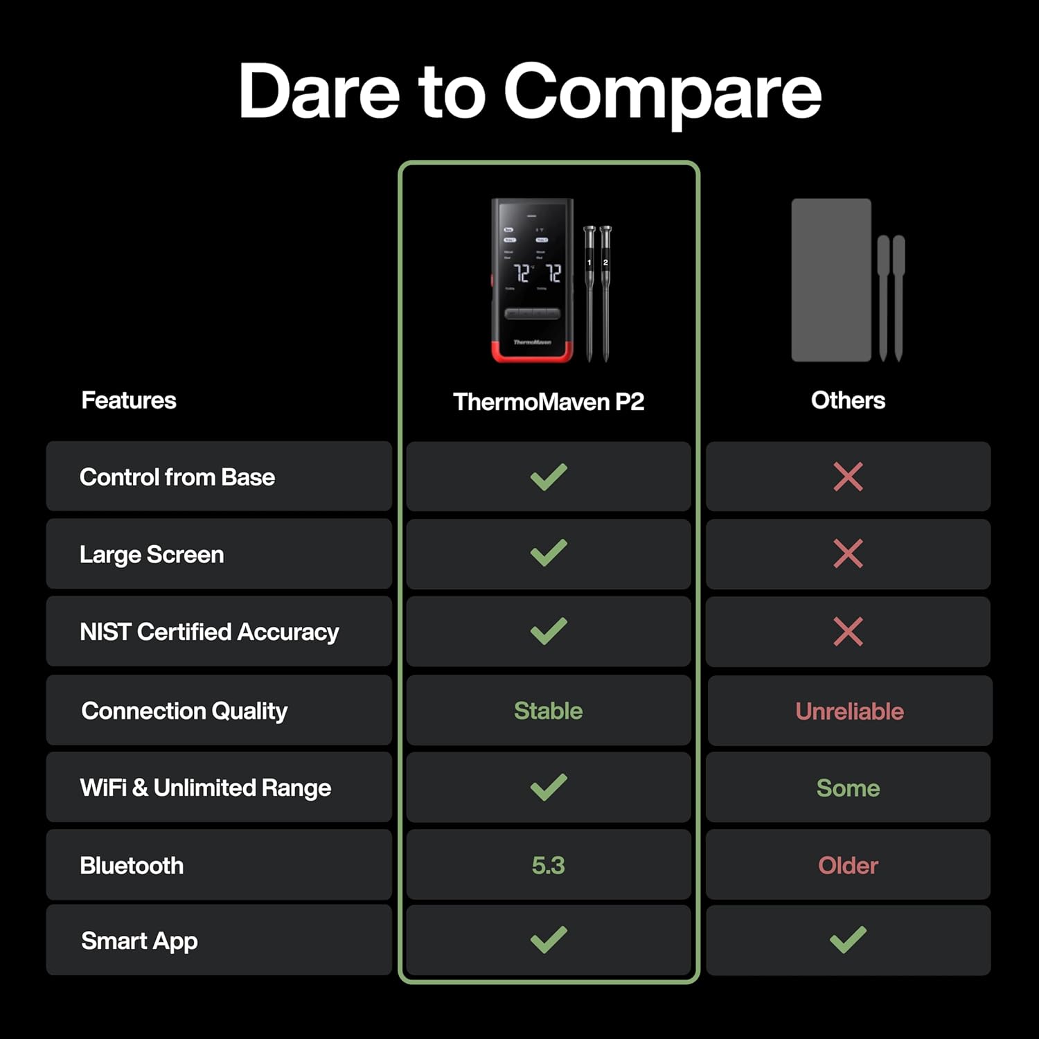 Smart Display Base: Unlike other thermometers that require an app to function, the P2’s display base provides real-time readings and lets you set temperatures directly on the device. A smart app is also available, giving you the best of both worlds.