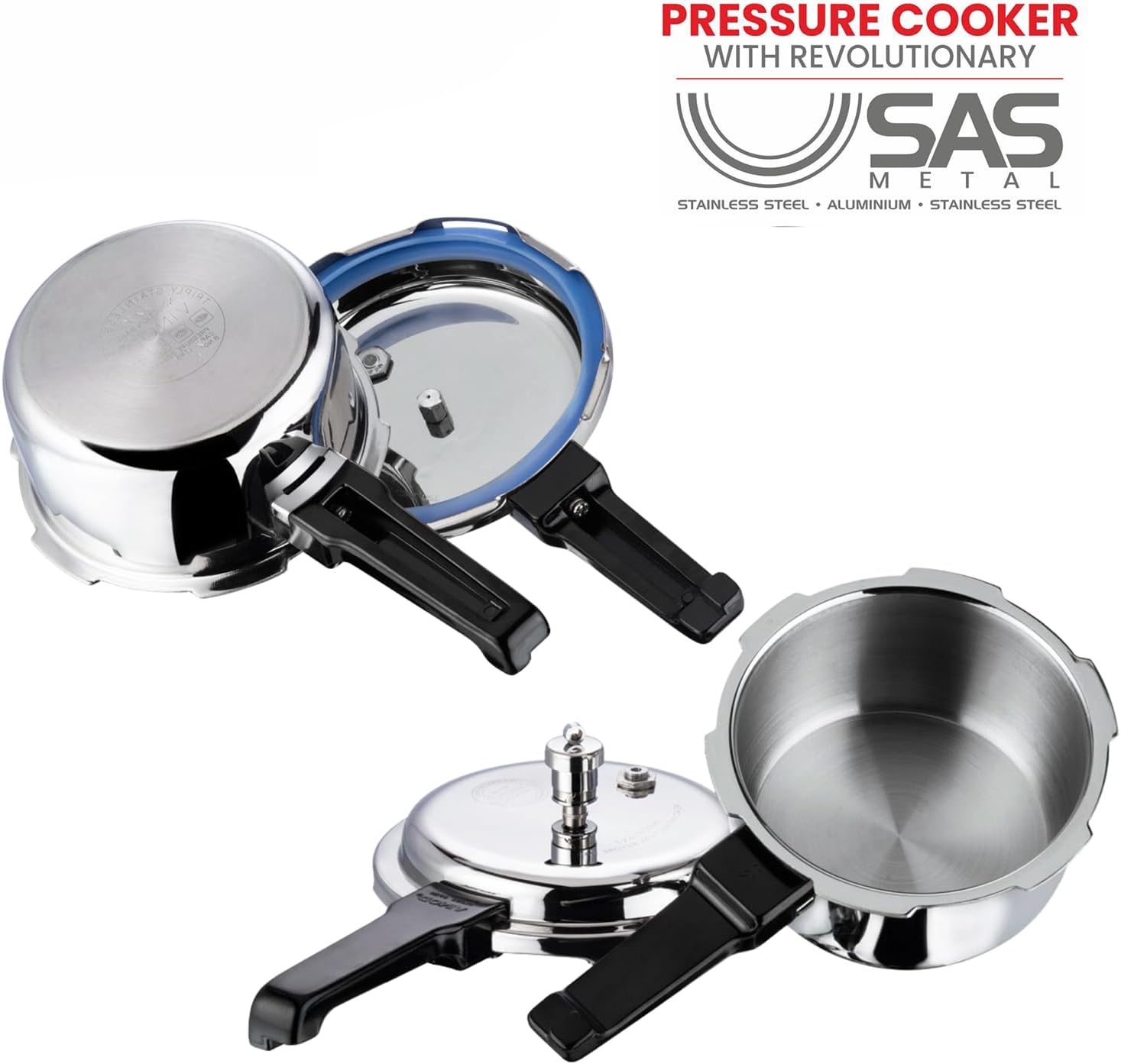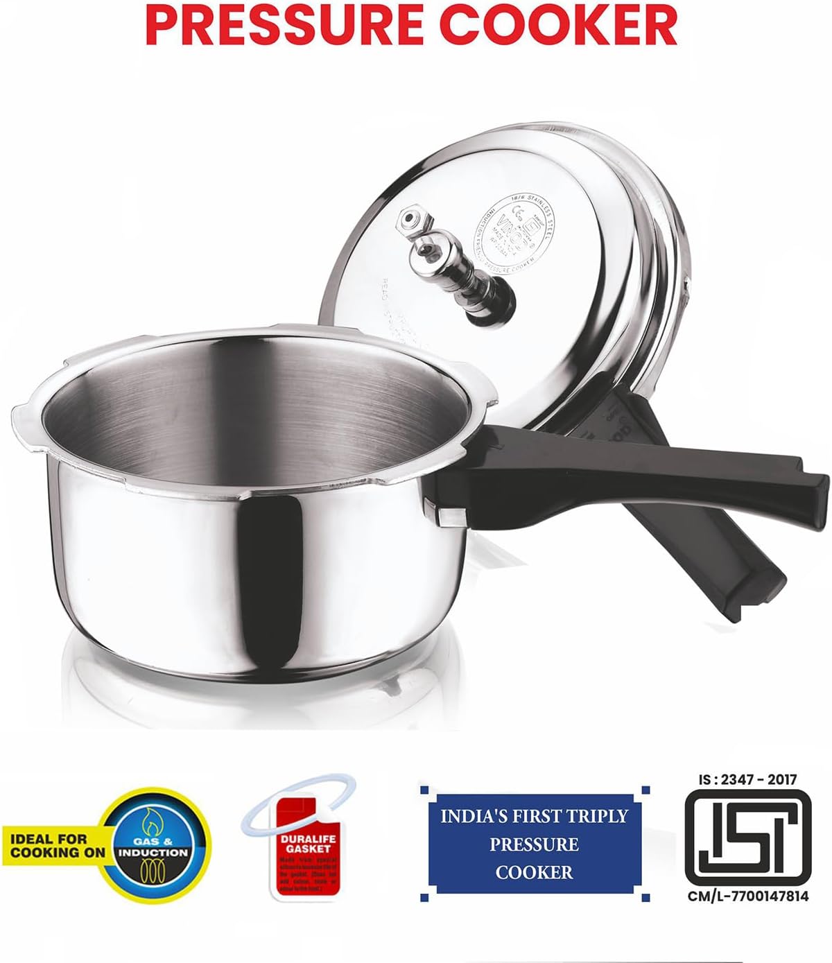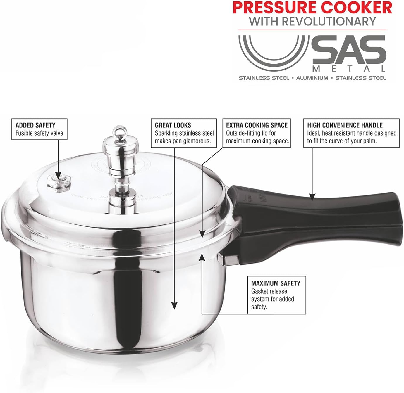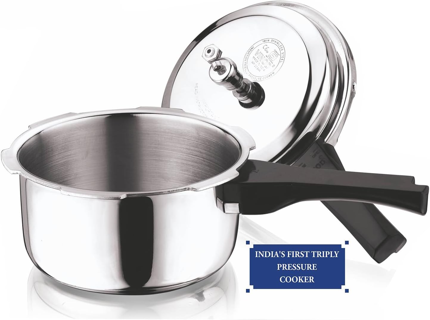 Vinod Platinum Triply Stainless Steel Outer Lid Pressure Cooker -68 oz , Induction Friendly, ISI Certified, Small Pressure Cooker for Quick Meals, Silver