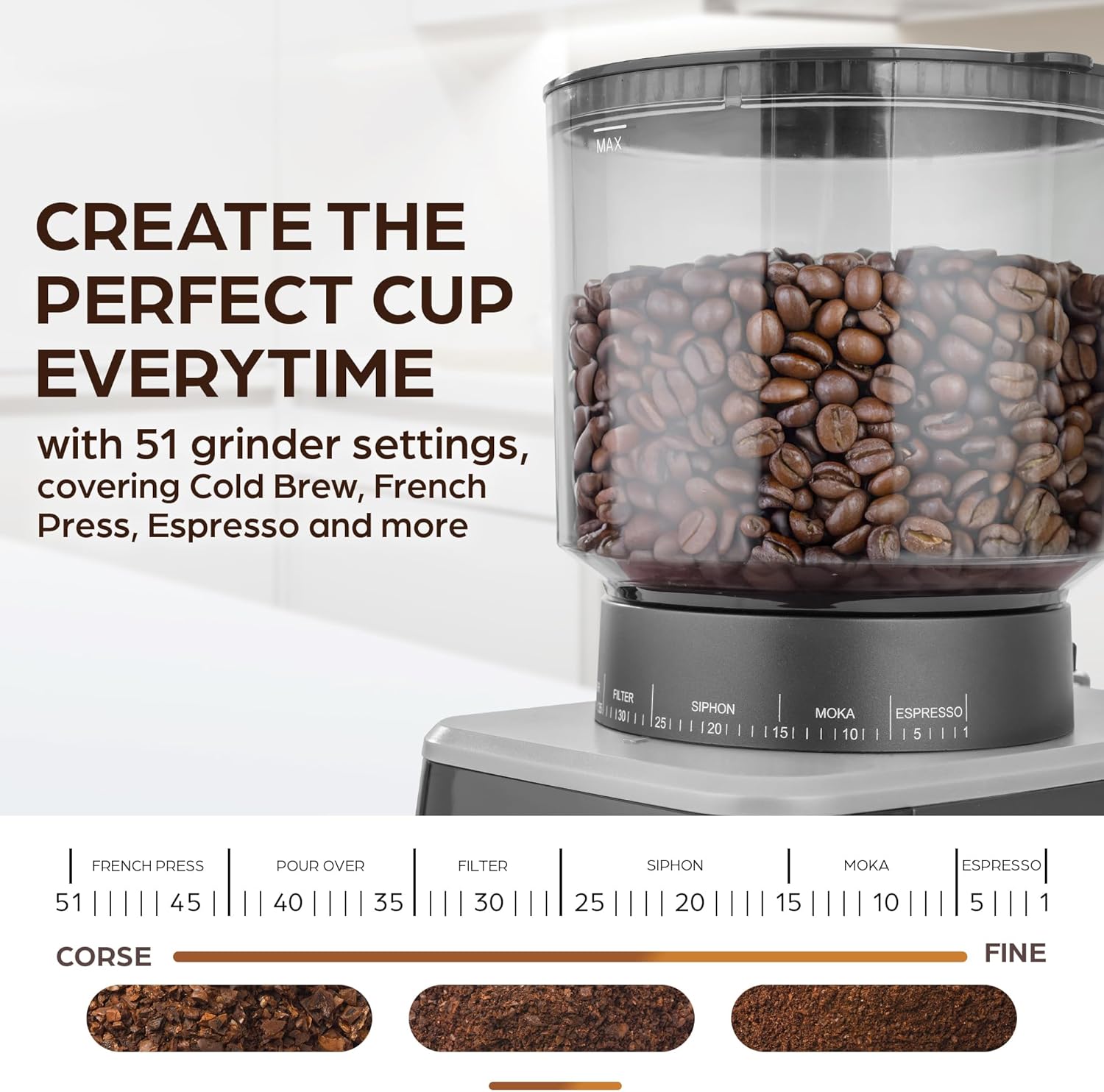 CHOOSE FROM 51 GRIND SETTINGS: This burr coffee grinder is designed with a conical burr grinder that operates at a low speed to minimize heat and help release the oils for optimal flavor. With our espresso coffee grinder’s 51 adjustable settings, create your perfect cup – from Espresso finesse to French press coarseness!