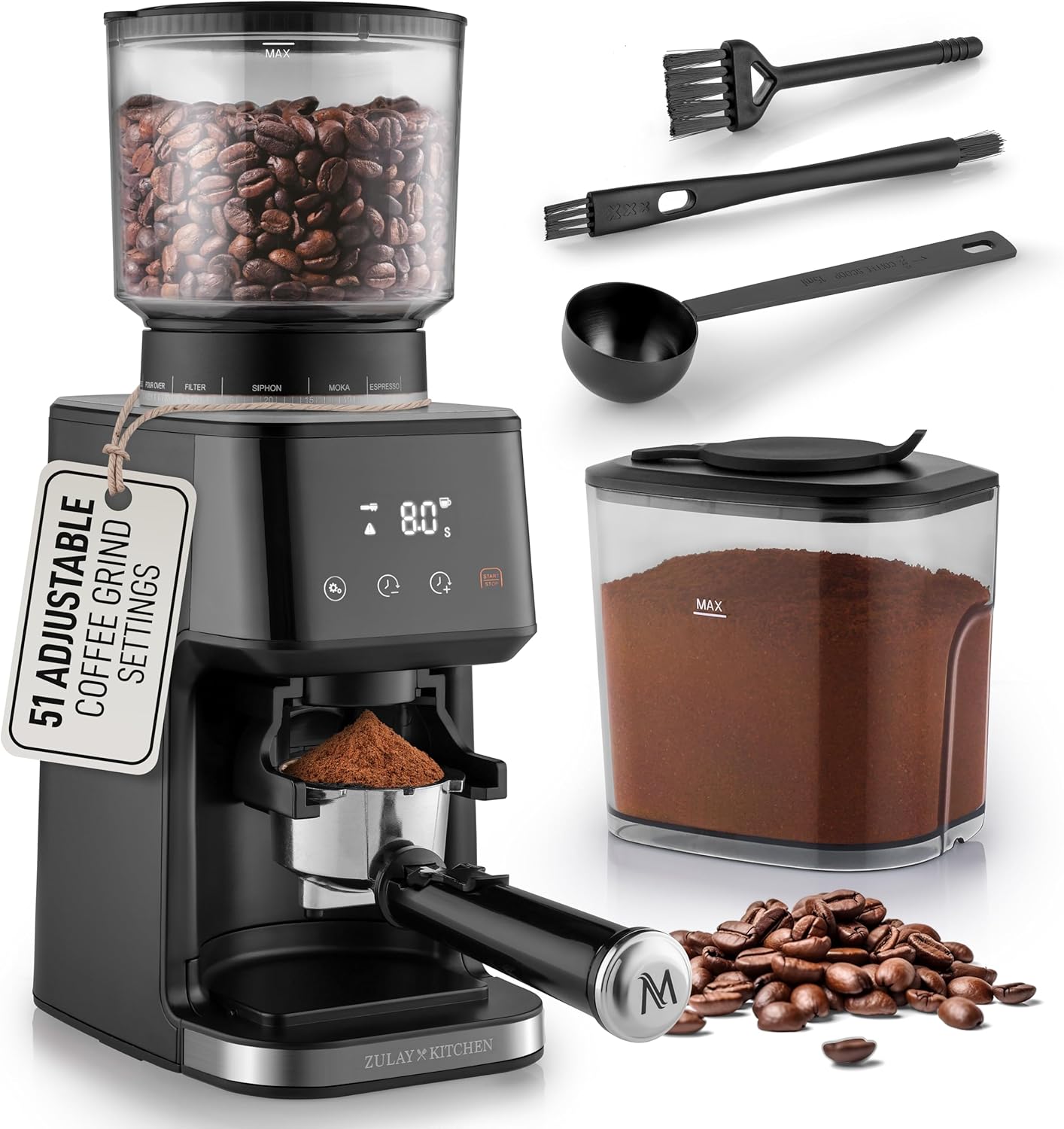 Zulay Kitchen Conical Espresso Burr Coffee Grinder – Touchscreen, 51 Bean Grind Settings, Precision Electric Timer, Stainless Steel – Includes Metal Scooper & 2 Cleaning Brushes